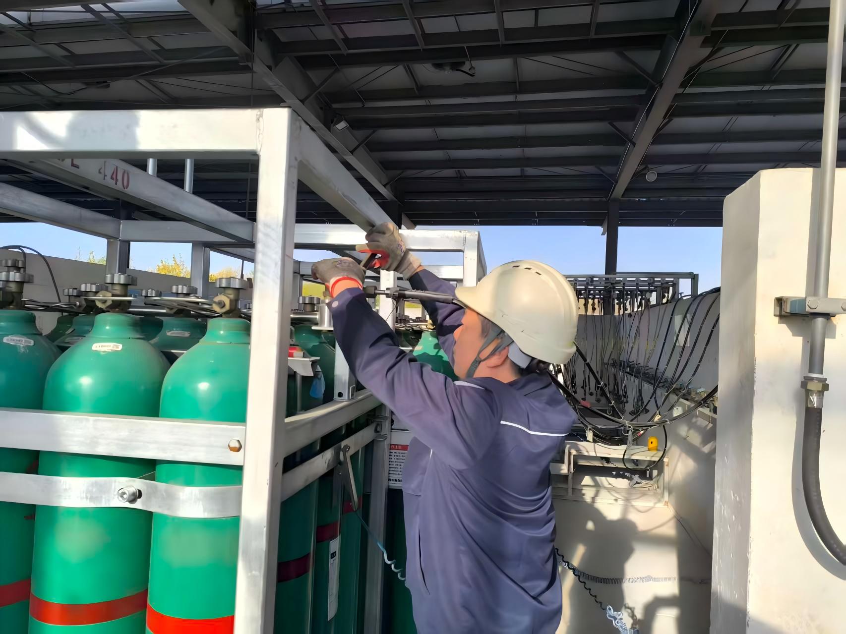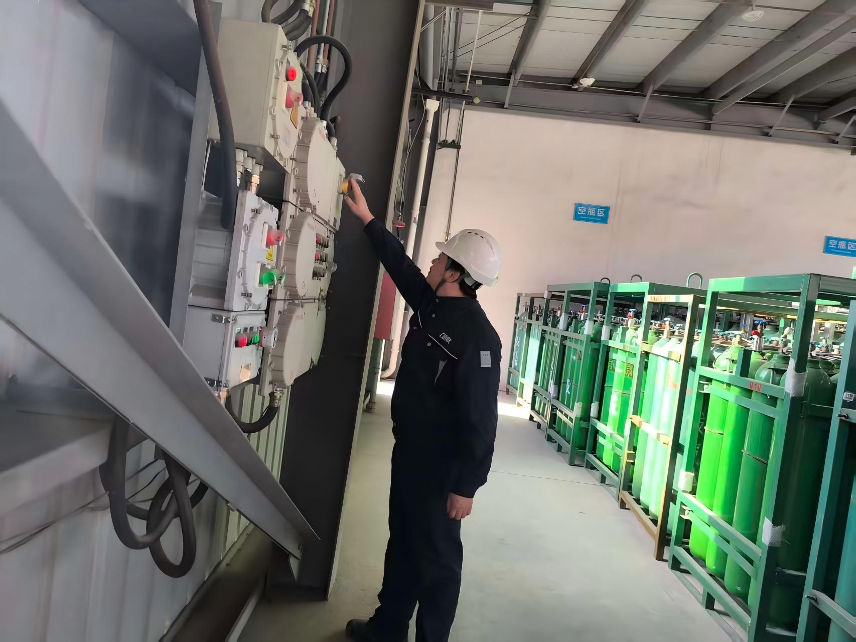 鋼瓶充裝班孔令東按下鋼瓶充裝緊急切斷閥“按鈕”,關(guān)閉充裝進(jìn)口總閥。張庭關(guān)閉集裝格保壓閥,張慶輝打開(kāi)放空閥泄壓,迅速拆除正在充裝的集裝格。